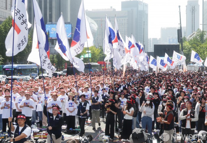 [서울=뉴스핌] 양윤모 기자 = 전국금융산업노동조합(금융노조)이 26일 오전 서울 광화문 세종대로에서 주 4.5일제 시행과 임금 인상 등을 요구하는 '9.26 총파업' 집회를 개최하고 있다. 은행원들이 거리로 나서는 은행권 총파업은 2022년 9월 이후 약 3년 만이다. 총파업에는 KB국민은행, 신한은행, 하나은행, 우리은행 등 주요 시중은행과 산업은행, 기업은행 등 국책은행 소속 42개 지부 10만여 조합원이 참여할 예정이다. 2025.09.26 yym58@newspim.com