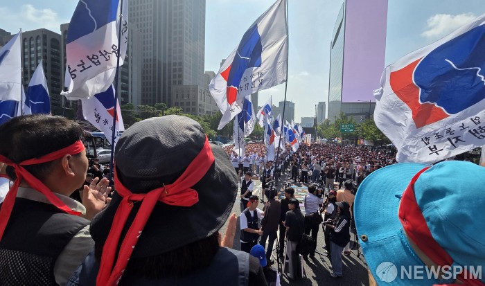 [서울=뉴스핌] 양윤모 기자 = 전국금융산업노동조합(금융노조)이 26일 오전 서울 광화문 세종대로에서 주 4.5일제 시행과 임금 인상 등을 요구하는 '9.26 총파업' 집회를 개최하고 있다. 은행원들이 거리로 나서는 은행권 총파업은 2022년 9월 이후 약 3년 만이다. 총파업에는 KB국민은행, 신한은행, 하나은행, 우리은행 등 주요 시중은행과 산업은행, 기업은행 등 국책은행 소속 42개 지부 10만여 조합원이 참여할 예정이다. 2025.09.26 yym58@newspim.com