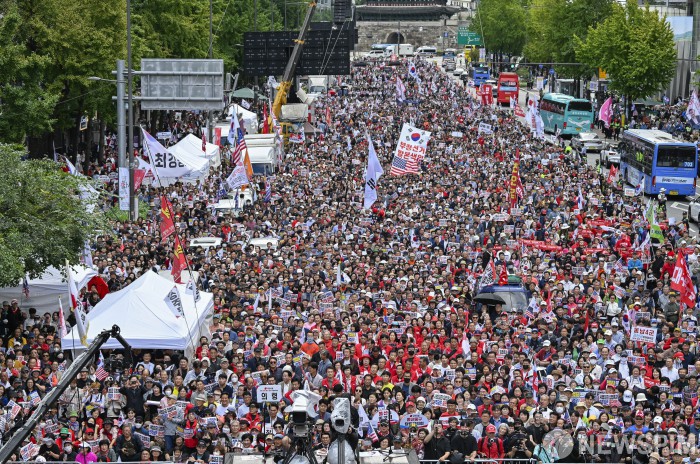 [서울=뉴스핌] 정일구 기자 = 28일 오후 서울 중구 시청역 인근에서 국민의힘 주최로 사법파괴·입법독재 국민 규탄대회가 열리고 있다. 2025.09.28 mironj19@newspim.com