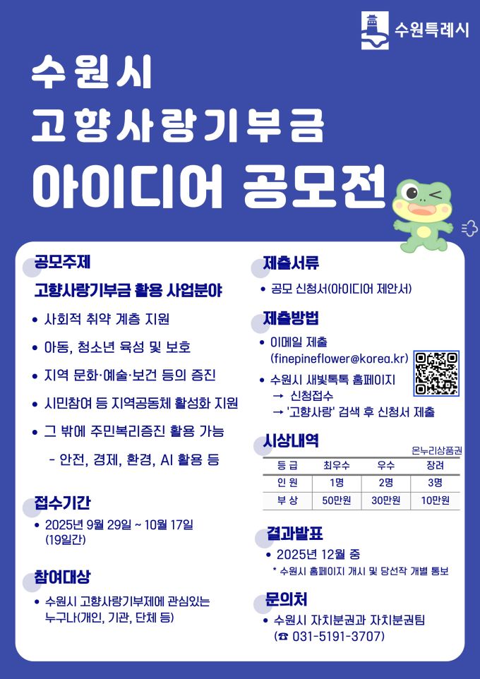 수원시 관계자는 "이번 공모전은 전 국민이 참여해 수원의 미래를 함께 만들어가는 참여형 프로젝트"라며 "기부자와 시민의 아이디어가 정책으로 실현되도록 노력해 고향사랑 기부제가 지역 발전의 실질적 성과로 이어지게 하겠다"고 말했다.