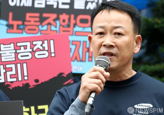[서울=뉴스핌] 최지환 기자 = 오상훈 삼성그룹노조연대 의장이 30일 오후 서울 서초구 삼성전자빌딩 앞에서 열린 삼성그룹노동조합연대 투명하고 공정한 성과급 제도로의 개선을 촉구하는 기자회견에서 발언하고 있다. 2025.09.30 choipix16@newspim.com
