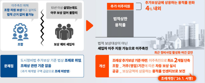 그동안 구역지정 공람공고 3개월 이전보다 단 하루라도 늦게 입주한 세입자는 한 푼의 이주비도 받을 수 없었다. 이에 따라 장기 거주를 이유로 보상을 요구하며 이주를 거부하는 세입자와 합의할 수 있는 제도적 근거가 마련될 전망이다. 다만 임대주택은 받을 수 없다.
