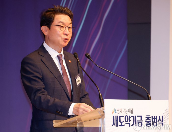 [서울=뉴스핌] 류기찬 기자 = 이억원 금융위원장이 1일 오전 서울 중구 한국프레스센터에서 열린 ‘새도약기금 출범식’에서 축사를 하고 있다. 2025.10.01 ryuchan0925@newspim.com