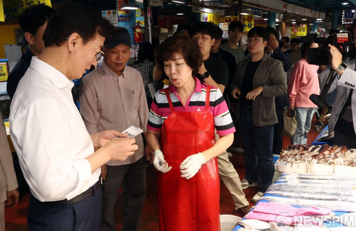 [서울=뉴스핌] 최지환 기자 = 전재수 해양수산부 장관이 1일 오후 서울 마포구 마포농수산물시장을 현장방문해 온누리상품권으로 생선을 구매하고 있다. 2025.10.01 choipix16@newspim.com