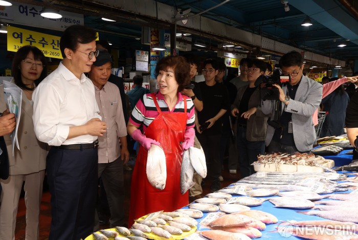 [서울=뉴스핌] 최지환 기자 = 전재수 해양수산부 장관이 1일 오후 서울 마포구 마포농수산물시장을 현장방문해 온누리상품권으로 생선을 구매하고 있다. 2025.10.01 choipix16@newspim.com