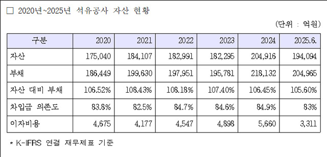1일 권향엽 더불어민주당 의원실이 석유공사에서 제출받은 자료에 따르면 석유공사는 2024년 기준 자산 20조 4916억 원, 부채 21조 8132억 원으로 부채비율이 106%에 달했고 차입금 의존도 또한 84.9%로 역대 최고치를 기록했다.