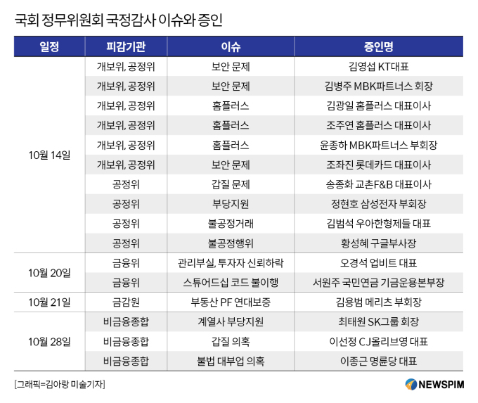 [서울=뉴스핌] 채송무 기자 = 추석 연휴 이후 본격적으로 국회 국정감사가 열리는 가운데 정무위원회에서는 금융권 보안 사고와 많은 피해자를 낳았던 홈플러스 문제, 온라인 플랫폼의 불공정거래 문제 등이 이슈가 될 것으로 보인다.