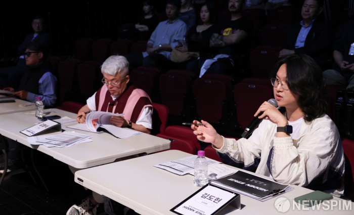 [서울=뉴스핌] 최지환 기자 = 1일 오후 서울 동대문구 콘텐츠문화광장 스테이지66에서 열린 제3회 싱어송라이터 경연대회 '히든스테이지(HIDDEN STAGE)' 결선에서 김도헌 심사위원이 심사평을 하고 있다. '히든스테이지'는 종합뉴스통신사 뉴스핌과 감엔터테인먼트가 주최·주관하고, 문화체육관광부·서울특별시·한국콘텐츠진흥원·한국음악저작권협회가 후원한다. 2025.10.01 choipix16@newspim.com