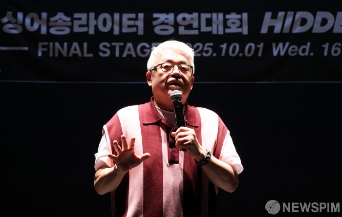 [서울=뉴스핌] 최지환 기자 = 1일 오후 서울 동대문구 콘텐츠문화광장 스테이지66에서 열린 제3회 싱어송라이터 경연대회 '히든스테이지(HIDDEN STAGE)' 결선에서 김형석 심사위원장이 심사 총평을 하고 있다. '히든스테이지'는 종합뉴스통신사 뉴스핌과 감엔터테인먼트가 주최·주관하고, 문화체육관광부·서울특별시·한국콘텐츠진흥원·한국음악저작권협회가 후원한다. 2025.10.01 choipix16@newspim.com