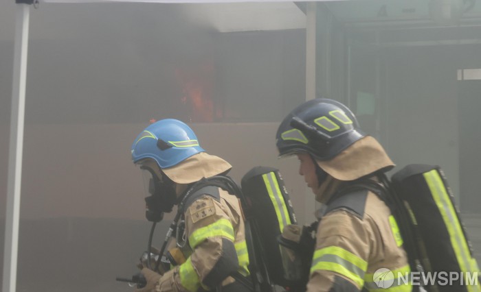 [서울=뉴스핌] 양윤모 기자 = 전기 이륜자동차와 개인용 이동장치의 이동 수단 확대로 화재가 계속되는 가운데, 서울소방재난본부가 주최한 대용량 리튬배터리 실물 화재재현 실험이 1일 오후 노원구 상계 마들아파트 재건축 현장에서 열렸다. 서울소방재난본부는 리튬이온 배터리팩 발화를 이용해 실제 아파트 화재 상황을 재현 화재 진압 전술과 인명 구조 능력을 강화하는 훈련으로 진행했다. 2025.10.01 yym58@newspim.com