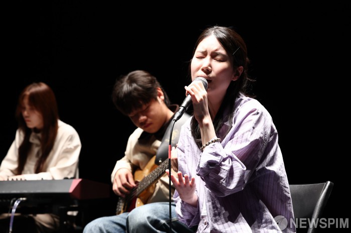 [서울=뉴스핌] 최지환 기자 = 1일 오후 서울 동대문구 콘텐츠문화광장 스테이지66에서 열린 제3회 싱어송라이터 경연대회 '히든스테이지(HIDDEN STAGE)' 결선에서 참가번호 9번 윈지가 경연을 펼치고 있다. '히든스테이지'는 종합뉴스통신사 뉴스핌과 감엔터테인먼트가 주최·주관하고, 문화체육관광부·서울특별시·한국콘텐츠진흥원·한국음악저작권협회가 후원한다. 2025.10.01 choipix16@newspim.com