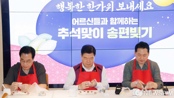 [서울=뉴스핌] 윤창빈 기자 = 장동혁 국민의힘 대표, 송언석 원내대표, 이필형 동대문구청장이 2일 오전 서울 동대문구 동백꽃노인종합복지관에서 추석맞이 송편빚기 봉사활동을 하고 있다. 2025.10.02 pangbin@newspim.com