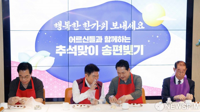 [서울=뉴스핌] 윤창빈 기자 = 장동혁 국민의힘 대표, 송언석 원내대표, 이필형 동대문구청장이 2일 오전 서울 동대문구 동백꽃노인종합복지관에서 추석맞이 송편빚기 봉사활동을 하고 있다. 2025.10.02 pangbin@newspim.com