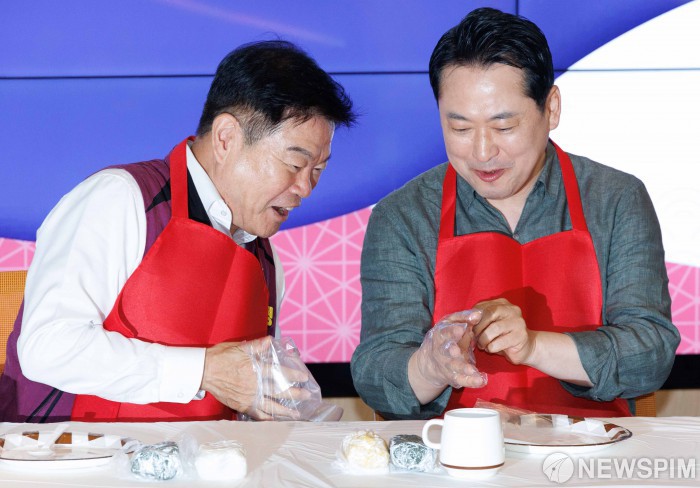 [서울=뉴스핌] 윤창빈 기자 = 장동혁 국민의힘 대표, 이필형 동대문구청장이 2일 오전 서울 동대문구 동백꽃노인종합복지관에서 추석맞이 송편빚기 봉사활동을 하고 있다. 2025.10.02 pangbin@newspim.com