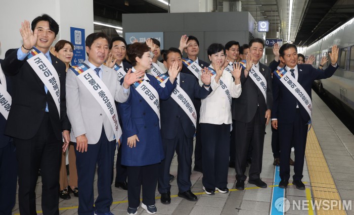 [서울=뉴스핌] 정일구 기자 = 정청래 더불어민주당 대표와 김병기 원내대표를 비롯한 의원들이 추석 연휴를 앞둔 2일 오전 서울 용산구 용산역에서 귀성객들에게 인사하고 있다. 2025.10.02 mironj19@newspim.com