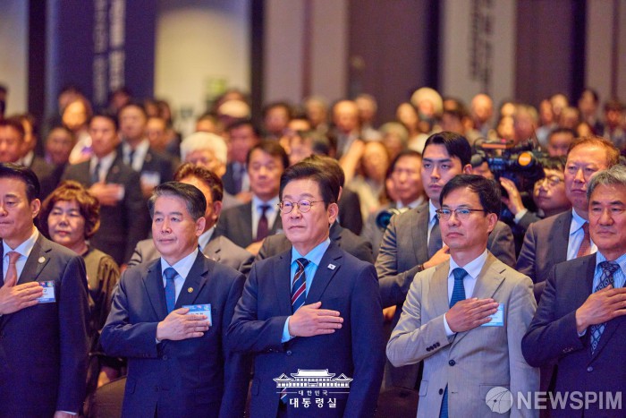 [서울=뉴스핌] 이재명 대통령이 2일 서울 광진구 그랜드워커힐서울 호텔에서 열린 제19회 세계 한인의 날 기념식에서 국기에 대한 경례를 하고 있다. [사진=대통령실] 2025.10.02 photo@newspim.com