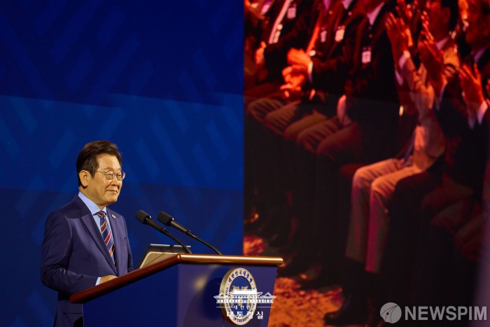 [서울=뉴스핌] 이재명 대통령이 2일 서울 광진구 그랜드워커힐서울 호텔에서 열린 제19회 세계 한인의 날 기념식에서 박수를 받고 있다. [사진=대통령실] 2025.10.02 photo@newspim.com