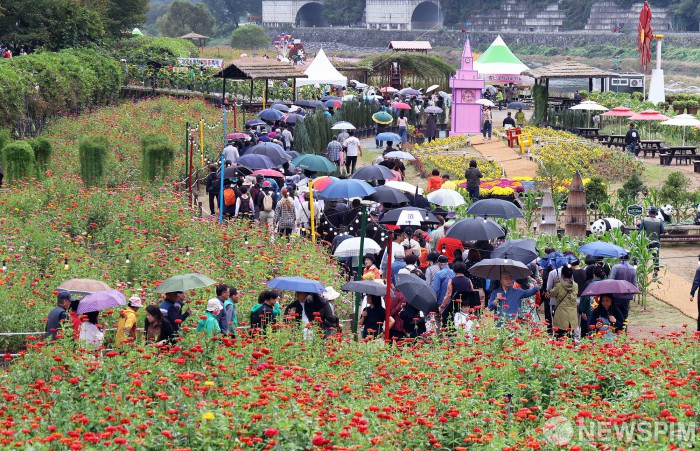 [서울=뉴스핌] 양윤모 기자 = 3일 오후 추석연휴를 맞아 평창읍 평창강 일원에서 열린 '2025 평창 백일홍축제'의 산소길 걷기대회에 참가한 방문객들이 만개한 백일홍 꽃밭을 걷고 있다. '가을향기, 백일홍으로 물들다'를 주제로 열리는 올 해 축제는 백일홍, 코스모스 등 다양한 볼거리 및 체험 프로그램으로 12일까지 펼쳐진다. 이와 함께 축제 기간 평창읍 기관과 주민이 참여하는 야시장과 먹거리 존이 운영되며, 연계 행사로 평창읍 전통시장에서는 달빛장터, 노람들에서는 한가위 평창 에코라이트쇼가 개최된다. [사진= 평창군청] 2025.10.03 yym58@newspim.com