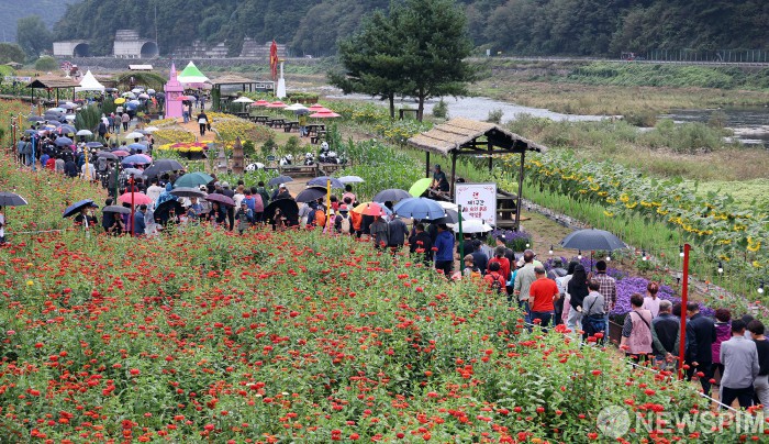 [서울=뉴스핌] 양윤모 기자 = 3일 오후 추석연휴를 맞아 평창읍 평창강 일원에서 열린 '2025 평창 백일홍축제'의 산소길 걷기대회에 참가한 방문객들이 만개한 백일홍 꽃밭을 걷고 있다. '가을향기, 백일홍으로 물들다'를 주제로 열리는 올 해 축제는 백일홍, 코스모스 등 다양한 볼거리 및 체험 프로그램으로 12일까지 펼쳐진다. 이와 함께 축제 기간 평창읍 기관과 주민이 참여하는 야시장과 먹거리 존이 운영되며, 연계 행사로 평창읍 전통시장에서는 달빛장터, 노람들에서는 한가위 평창 에코라이트쇼가 개최된다. [사진= 평창군청] 2025.10.03 yym58@newspim.com