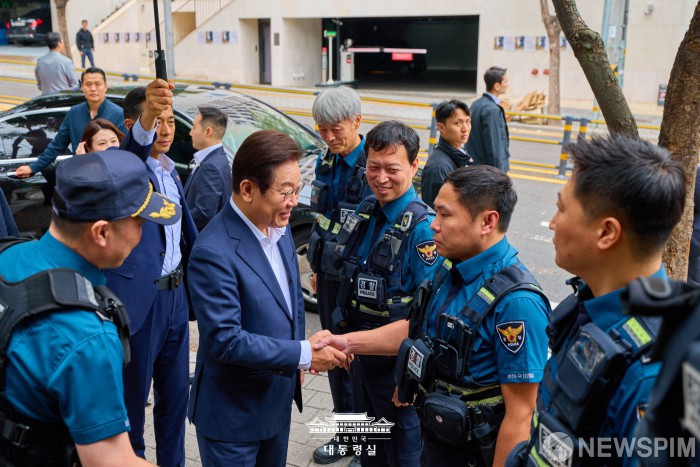 [서울=뉴스핌] 이재명 대통령이 3일 서울 중구 중부경찰서 약수지구대를 찾아 경찰관들과 인사를 나누고 있다. [사진=대통령실] 2025.10.03 photo@newspim.com