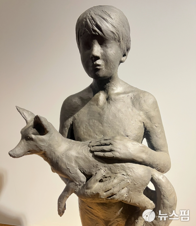 [서울=뉴스핌] 여우를 들고 있는 소년을 표현한 로랑 그라소(Laurent Grasso)의 조각 작품. 여우는 길잡이를 은유하는 동물이다. ©Laurent Grasso / ADAGP, Paris, 2025. Courtesy of the artis't and Perrotin [사진=이영란 미술전문기자] 2025.10.05 art29@newspim.com