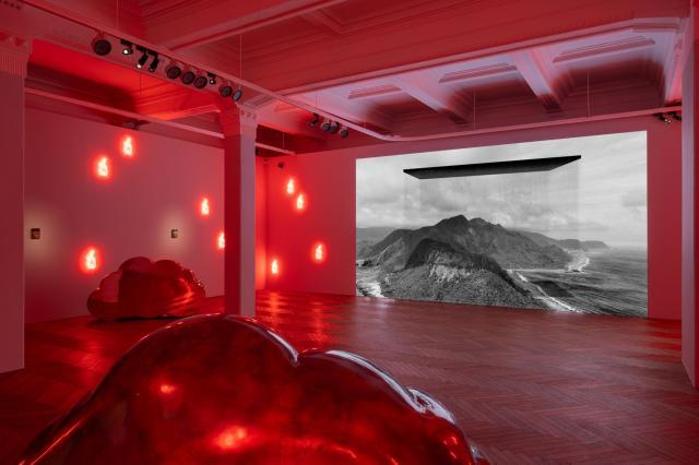 LED 영상작품 양 옆으로는 빗방울 형상의 붉은 네온들이 빛을 발하고 있다. 붉은 네온 빛방울들로 전시장 전체는 붉게 물들었다. 문득 평안의 시대는 저물고, 혼돈의 시대가 오는 것인가 질문하게 만든다. 대형 스크린 왼쪽에는 육중한 구름 조각이 또아리를 틀고 자리잡았다. 하늘에 있어야 할 흰 구름이 어째서 땅에 내려온 걸까? 궁금해지는데 브론즈로 된 거대한 구름조각 뒷면을 보니 거뭇거뭇하다. 지상으로 낙하하며 오염된 것일까. 몽상에 빠져들게 된다.
