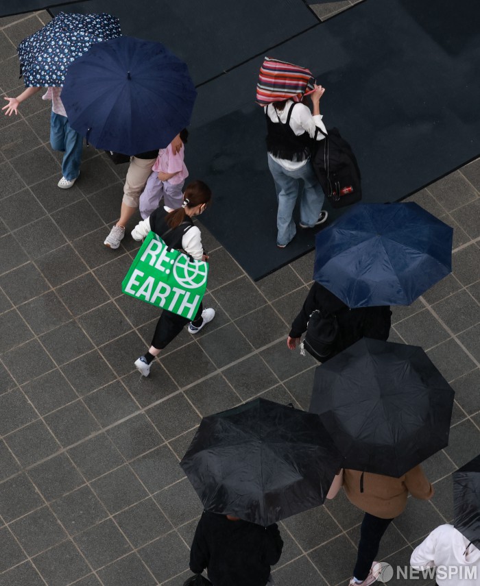 [서울=뉴스핌] 김학선 기자 = 추석 전날인 5일 전국적으로 비가 내리는 가운데 서울역에서 시민들이 비를 피해 걷고 있다. 2025.10.05 yooksa@newspim.com