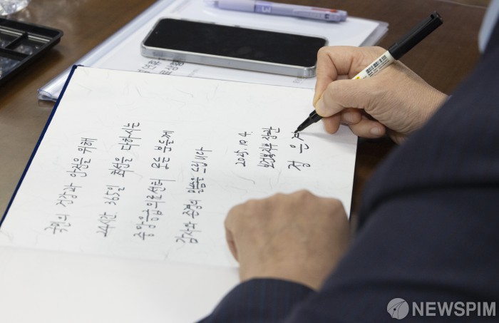 [서울=뉴스핌] 정은경 보건복지부 장관이 지난 4일 서울 중구 국립중앙의료원 중앙응급의료센터를 방문해 대규모 재난의료 상황 감시 및 대응 상황을 점검하고 방명록을 작성하고 있다. [사진=보건복지부] 2025.10.05 photo@newspim.com