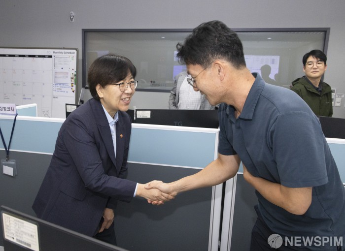 [서울=뉴스핌] 정은경 보건복지부 장관이 지난 4일 서울 중구 국립중앙의료원 중앙응급의료센터를 방문해 현장 근무 직원을 격려하고 있다. [사진=보건복지부] 2025.10.05 photo@newspim.com