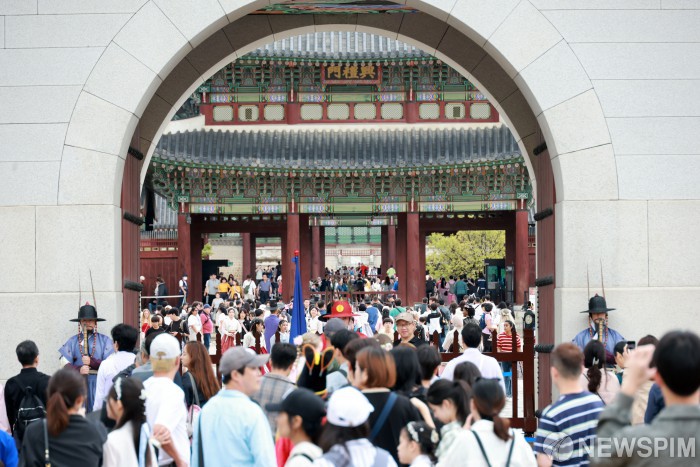 [서울=뉴스핌] 김학선 기자 = 추석 황금연휴를 맞아 서울의 주요 궁궐과 종묘, 조선왕릉 등이 무료 개방한 가운데 5일 서울 경복궁이 관람객들로 붐비고 있다. 2025.10.05 yooksa@newspim.com