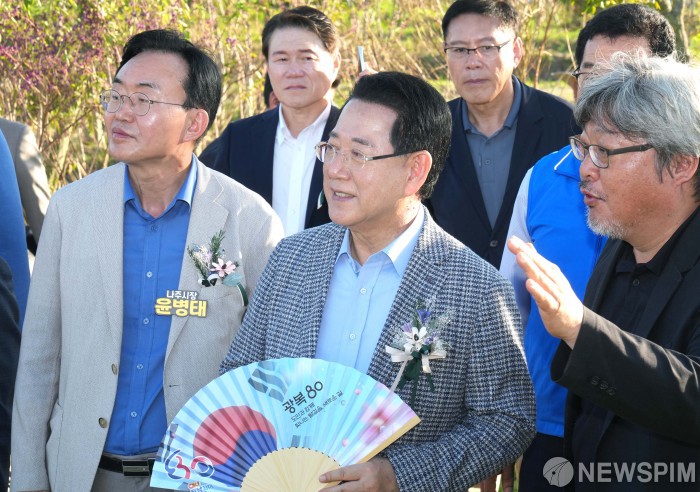 [나주=뉴스핌] 조은정 기자 = 김영록 전남도지사가 8일 나주 영산강정원 일원에서 열린 '2025년 전라남도 정원 페스티벌 개막식'에 참석해 주요내빈들과 정원을 둘러보고 있다. 2025.10.08 ej7648@newspim.com
