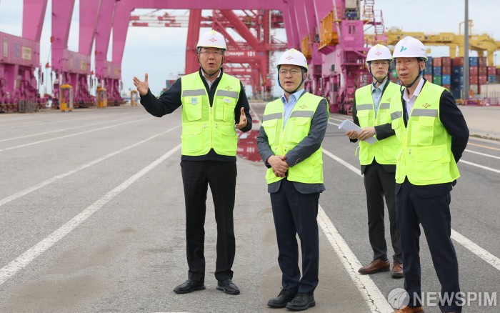 [서울=뉴스핌] 문신학 산업통상부 차관이 9일 인천 연수구 인천신항 내 선광신컨테이너터미널을 방문해 관계자로부터 운영현황을 보고받고 수출입 물류 상황을 점검하고 있다. [사진=산업통상부] 2025.10.09 photo@newspim.com