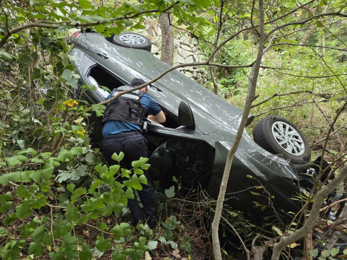 9일 오전 9시 52분경 부산 북구 만덕동 산길 오르막 코너에서 60대 여성이 운전하던 차량이 젖은 도로에 미끄러져 5m 아래로 추락하는 사고가 발생했다. [사진=부산북부경찰서] 2025.10.09