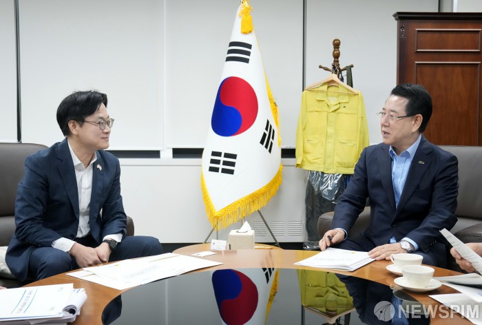 [무안=뉴스핌] 조은정 기자 = 김영록 전남도지사가 10일 오전 정부서울청사에서 김정관 산업통상부 장관과 면담을 갖고 석유화학·철강 산업 대전환 메가 프로젝트 등 전남도 핵심 사업 해결을 위한 건의 및 협조를 요청하고 있다. [사진=전남도] 2025.10.10 ej7648@newspim.com