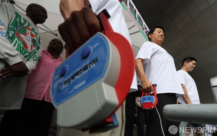 [서울=뉴스핌] 김학선 기자 = 오세훈 서울시장이 10일 서울 동대문 DDP 어울림 광장에서 열린 더 건강한 서울 9988, 체력 회복 챌린지 행사에서 근력측정을 하고 있다. 2025.10.10 yooksa@newspim.com