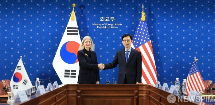 [서울=뉴스핌] 이길동 기자 = 박윤주 외교부 1차관이 10일 서울 종로구 외교부 청사에서 열린 한미 외교차관 전략대화에서 앨리슨 후커(Allison Hooker) 미 국무부 정무차관과 악수하며 기념촬영을 하고 있다. 2025.10.10gdlee@newspim.com