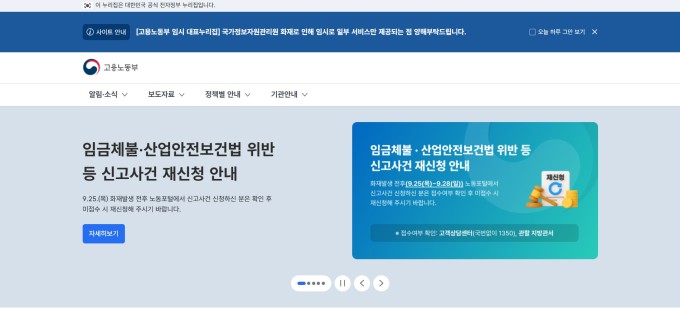 고용노동부 임시 홈페이지 첫 화면 [사진=고용노동부 홈페이지 갈무리] 2025.10.10 sheep@newspim.com |