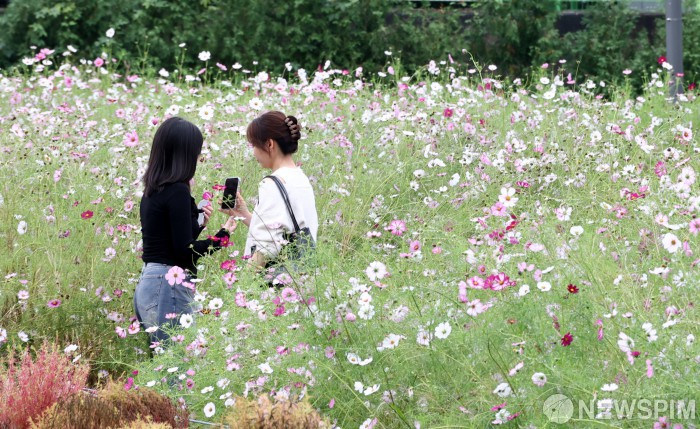 [서울=뉴스핌] 최지환 기자 = 비가 그친 11일 서울 종로구 열린송현녹지광장에서 시민들이 꽃밭을 거닐고 있다. 2025.10.11 choipix16@newspim.com