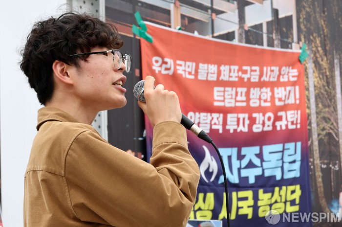 [서울=뉴스핌] 최지환 기자 = 한국대학생진보연합 등 진보 학생단체가 결성한 자주독립 대학생 시국 농성단이 11일 오후 서울 종로구 미국대사관 앞 광화문광장에서 트럼프 미 대통령을 규탄하는 미신고 집회를 진행하고 있다. 2025.10.11 choipix16@newspim.com