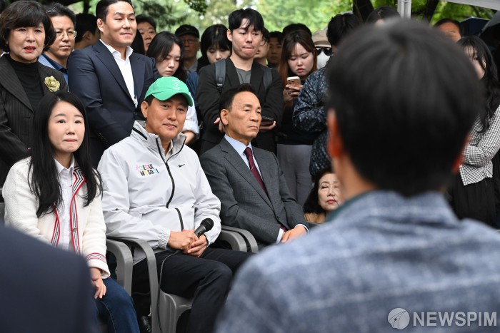 [서울=뉴스핌] 김학선 기자 = 오세훈 서울시장이 13일 오전 재건축 정비계획 변경안이 통과된 서울 강남구 대치동 은마아파트를 찾아 주민 간담회를 하고 있다. 2025.10.13 yooksa@newspim.com