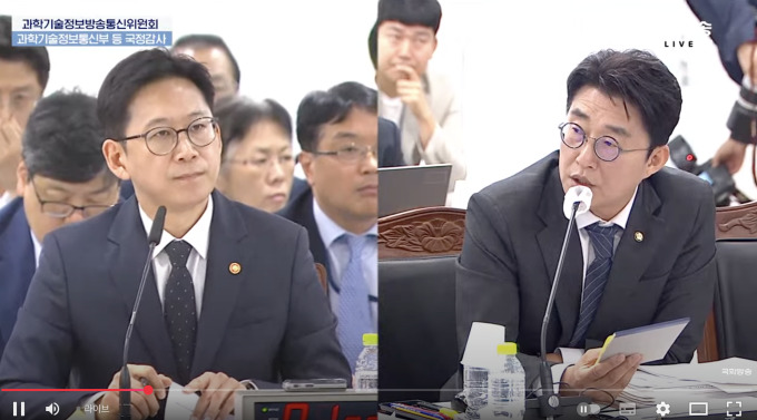 더불어민주당 노종면 의원(사진 오른쪽)이 13일 정부세종청사에서 열린 국회 과학기술정보방송통신위원회 국정감사에서 배경훈 부총리 겸 과학기술정보통신부 장관(왼쪽)에게 질의하고 있다. [사진=국회방송] 2025.10.13 biggerthanseoul@newspim.com |