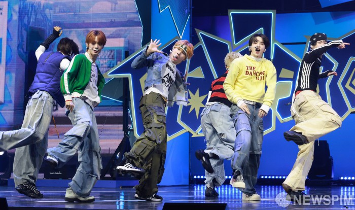 [서울=뉴스핌] 김학선 기자 = 그룹 투어스(TWS/신유, 도훈, 영재, 한진, 지훈, 경민)가 13일 서울 광진구 예스24라이브홀에서 열린 미니 4집 ‘play hard’ 쇼케이스에서 타이틀곡 'OVERDRIVE'(오버드라이브)를 선보이고 있다. 'OVERDRIVE'는 과열된 상태를 뜻하는 제목처럼, 좋아하는 것에 푹 빠진 TWS의 폭발하는 감정을 그린 곡이다. 2025.10.13 yooksa@newspim.com