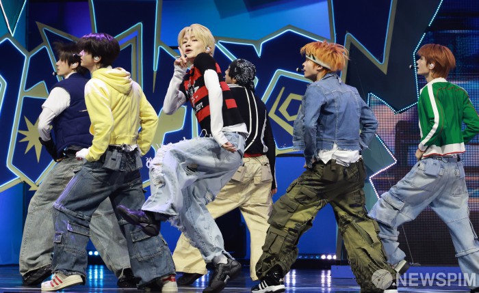 [서울=뉴스핌] 김학선 기자 = 그룹 투어스(TWS/신유, 도훈, 영재, 한진, 지훈, 경민)가 13일 서울 광진구 예스24라이브홀에서 열린 미니 4집 ‘play hard’ 쇼케이스에서 타이틀곡 'OVERDRIVE'(오버드라이브)를 선보이고 있다. 'OVERDRIVE'는 과열된 상태를 뜻하는 제목처럼, 좋아하는 것에 푹 빠진 TWS의 폭발하는 감정을 그린 곡이다. 2025.10.13 yooksa@newspim.com