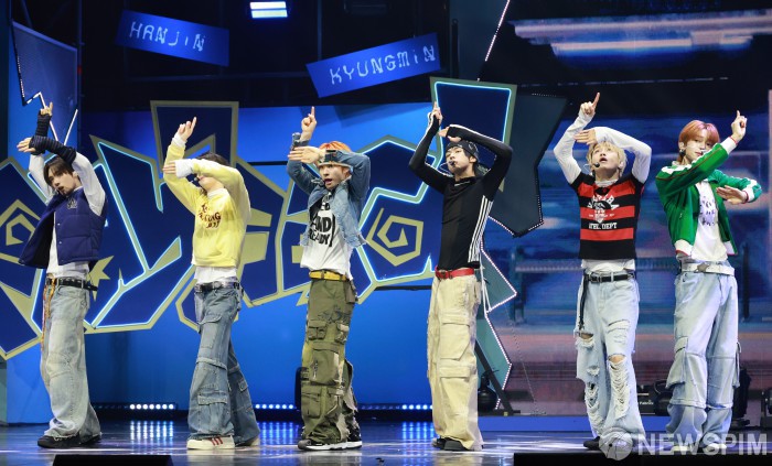 [서울=뉴스핌] 김학선 기자 = 그룹 투어스(TWS/신유, 도훈, 영재, 한진, 지훈, 경민)가 13일 서울 광진구 예스24라이브홀에서 열린 미니 4집 ‘play hard’ 쇼케이스에서 타이틀곡 'OVERDRIVE'(오버드라이브)를 선보이고 있다. 'OVERDRIVE'는 과열된 상태를 뜻하는 제목처럼, 좋아하는 것에 푹 빠진 TWS의 폭발하는 감정을 그린 곡이다. 2025.10.13 yooksa@newspim.com