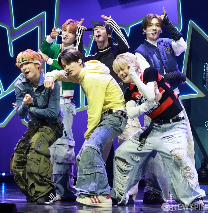 [서울=뉴스핌] 김학선 기자 = 그룹 투어스(TWS/신유, 도훈, 영재, 한진, 지훈, 경민)가 13일 서울 광진구 예스24라이브홀에서 열린 미니 4집 'play hard' 쇼케이스에서 타이틀곡 'OVERDRIVE'(오버드라이브)를 선보이고 있다. 'OVERDRIVE'는 과열된 상태를 뜻하는 제목처럼, 좋아하는 것에 푹 빠진 TWS의 폭발하는 감정을 그린 곡이다. 2025.10.13 yooksa@newspim.com