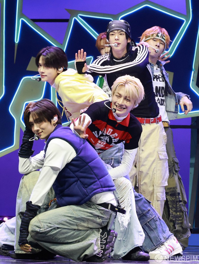 [서울=뉴스핌] 김학선 기자 = 그룹 투어스(TWS/신유, 도훈, 영재, 한진, 지훈, 경민)가 13일 서울 광진구 예스24라이브홀에서 열린 미니 4집 ‘play hard’ 쇼케이스에서 타이틀곡 'OVERDRIVE'(오버드라이브)를 선보이고 있다. 'OVERDRIVE'는 과열된 상태를 뜻하는 제목처럼, 좋아하는 것에 푹 빠진 TWS의 폭발하는 감정을 그린 곡이다. 2025.10.13 yooksa@newspim.com