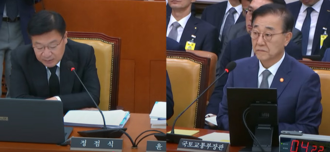13일 국회에서 열린 국토교통위원회 국정감사에서 김윤덕 국토교통부 장관이 정점식 국민의힘 의원으로부터 질의를 받고 있다. [사진=국회 유튜브 캡쳐] |