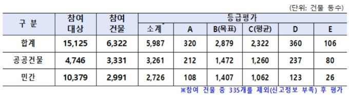 사업에는 서울 소재 건물 1만5000여 동 가운데 6322개 동(공공 3331개 동, 민간 2991개 동)이 참여했으며, 2024년도 준공 등 일부 평가가 불가한 건물을 제외한 수치다.