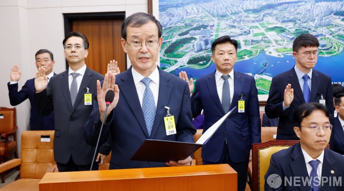[서울=뉴스핌] 류기찬 기자 = 한만희 해외건설협회 협회장이 13일 오후 서울 여의도 국회에서 열린 '2025년 국토교통부 등에 대한 국정감사'에 앞서 증인 선서를 하고 있다. 2025.10.13 ryuchan0925@newspim.com