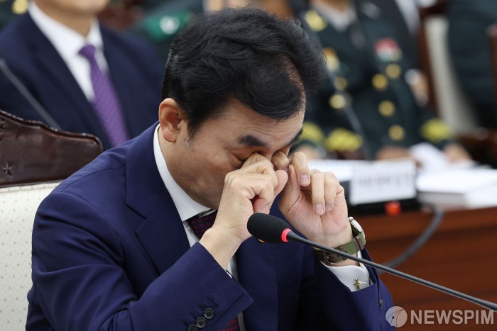 [서울=뉴스핌] 국회사진기자단 = 안규백 국방부 장관이 13일 오후 서울 용산구 국방부 청사에서 열린 '2025 국방부 국정감사'에서 눈을 비비고 있다. 2025.10.13 photo@newspim.com